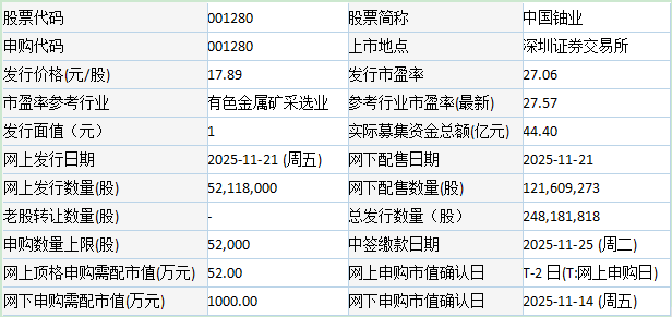 中国铀业股份有限公司保荐人(主承销商):中信证券股份有限公司 联席主承销商:中信证券股份有限公司 发行情况: 公司简介:中国铀业是一家致力于天然铀及放射性共伴生矿产资源综合利用的矿业公司。报告期内,主要从事天然铀资源的开采、冶炼、销售及贸易,以及独居石、铀钼、钽、铌等放射性共伴生矿产资源的综合利用及产品销售。截至招股说明书签署日,中核铀业直接持有中国铀业1,197,043,120股,持股比例为65.77%,为公司控股股东。中核集团通过C间接控制中国铀业79.48%的股份中核铀业、朝日核基金、中国核电、中国原子能、核冶金研究院、中核大地,是中国铀业的实际控制人。中国铀业2025年11月13日发布的首次公开发行股票并在主板上市招股说明书显示,公司拟募集资金41.1亿元,将用于天然铀产能项目、放射性共生矿产资源综合利用项目以及补充流动资金。中国铀业于2025年11月20日首次公开发行股票并在主板上市显示,公司投资项目预计新增募集资金41.1亿元。按发行价格17.89元/股计算,公司预计共募集资金443,997.27万元。扣除预计发行成本约人民币7,734.73万元(不含增值税)后,预计募集资金净额为436,262.54万元。